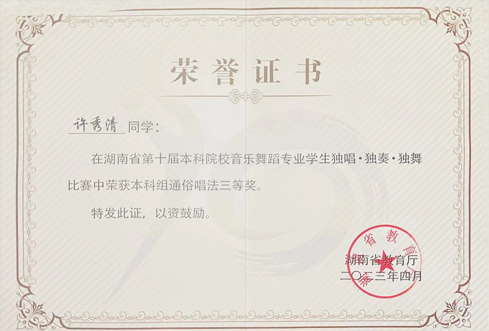 许秀清同学获湖南省第十届本科院校三独比赛通俗唱法三等奖