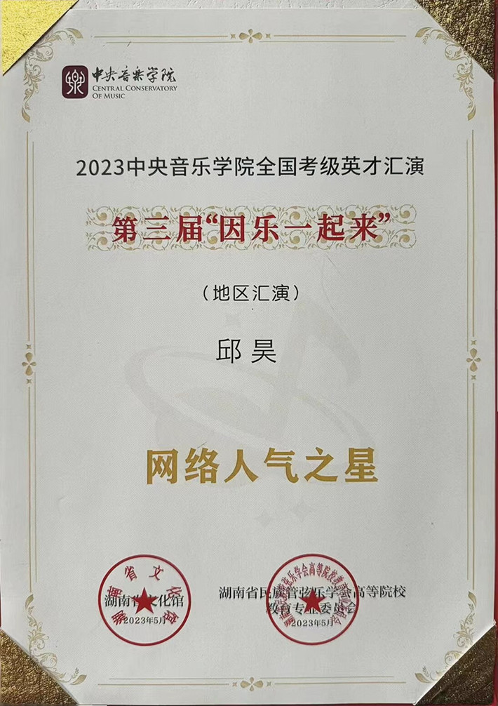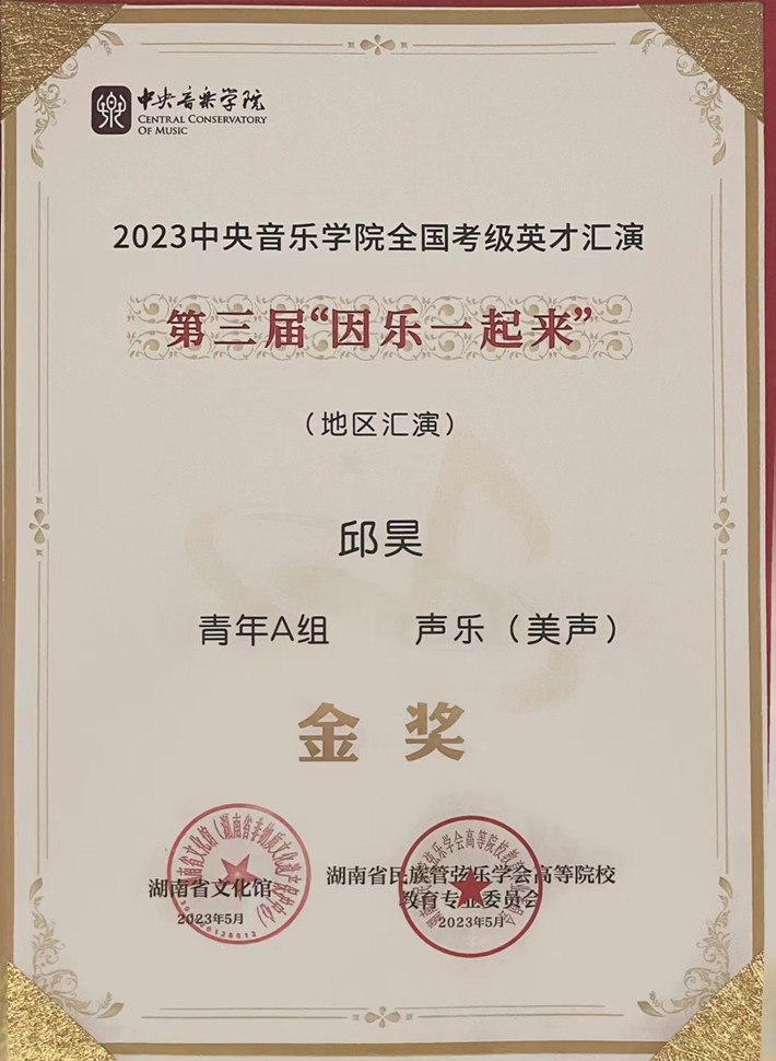 邱昊同学在2023中央音乐学院全国考级英才汇演中获青年组声乐金奖及网络人气之星