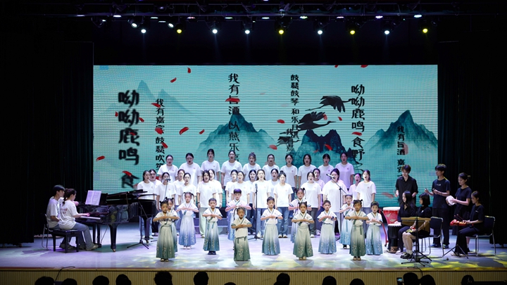 此次活动在学校党委制定的“五育并举”人才培养理念指导下,以弘扬中华优秀传统文化、坚定文化自信为宗旨,,设计了户外、室内两大体验活动区域。外场由民乐演奏、传统舞蹈、舞龙、华夏服饰秀等文艺表演活动,蹴鞠、画扇、猜谜等传统文化体验活动以及端午主题集市组成。从“娱、衣、书、画、食”等多个方面让参与者全方位沉浸式体验和感受中华传统文化的魅力。室内则是围绕端午节主题呈现的传统乐舞表演,《端午安康》《赛龙舟》《橘颂》等节目采用舞蹈的方式讲述了端午节的故事。学校林韵合唱团与学校幼儿子弟共同演绎了诗经合唱《小雅鹿鸣》,通过歌曲旋律与诗经朗诵融合的方式,呈现了先秦礼乐的恢弘。舞蹈《民族大联欢》将整场活动推向了高潮,也表达了全国各民族团结一心共度佳节的美好心愿。