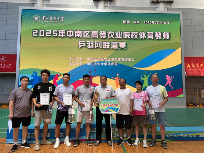 近日,由中南区高等农业院校体育理事会主办、华中农业大学承办的2025年中南区高等农业院校体育教师乒羽网联谊赛圆满落幕。来自9所农林高校的78名选手齐聚一堂,展开激烈角逐。我校代表队领队王志意,教练员沈煜,运动员张圣、石嘉蔚、钟理、朱敏佳、荣礴、苏小钟团结协作,在比赛中顽强拼搏,在参赛的4个项目中取得了2项第一名、1项第三名、1项第五名,团体第三名的优异成绩。