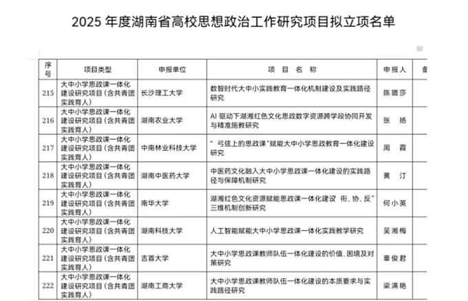 近日,湖南省教育厅公布了2025年度高校思想政治工作研究项目立项名单,我院音乐表演系周霞老师主持的《“弓弦上的思政课”赋能大中小学思政教育一体化建设研究》项目成功获批省级思政项目立项。